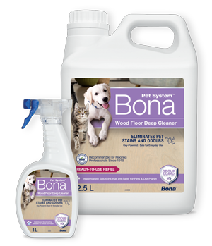 The Bona Care Pet System is a complete system for cleaning up after pets and removing pet odours.