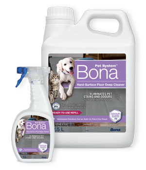 It’s easy to clean up after your furry friends with the Bona Pet Care System, a complete floor cleaning solution for the everyday mishaps that occur with pet ownership. The Bona Pet System eliminates everything from pet hair to bad pet odours, muddy paw prints, urine and mess stains.
